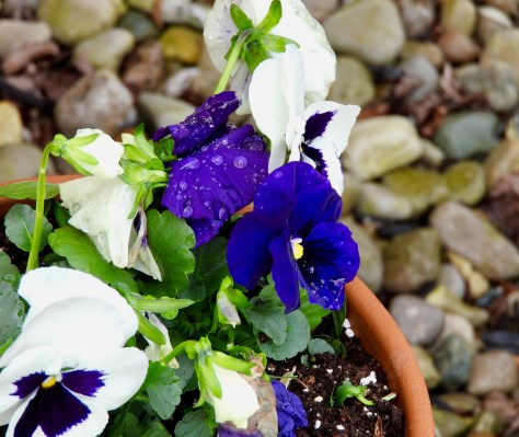 Last week while answering Cee’s questions I told you, my gentle readers, that I was looking forward to planting some pansies in a pot. Here is a photo of said pansies in said pot. Aren’t they pretty?