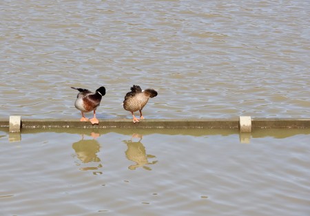 Two ducks that initially appeared to be in the middle of the lake who were sitting on top of the back of a park bench, normally by the side of the lake, now submerged under water because of flash flooding.